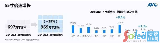 從銷售面積來看一下,今年1到4月份,我們的銷售面積達(dá)到了969萬平方米,同比去年增長了39%,這個(gè)39%的面積增長比起剛才所講的7%的銷量增長,是一個(gè)非常大的跨度,可見中國大陸在大尺寸化的路上越走越快。