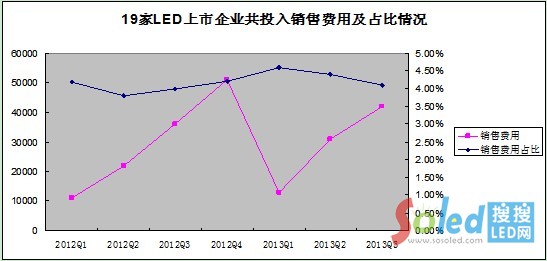 2013年以來,各企業(yè)發(fā)力渠道,加速品牌推廣。上半年,19家LED上市企業(yè)共投入銷售費用3.01億元,同比增長35.67%,占營收比重為4.41%,較去年同期提高0.51個百分點。前幾年LED 照明應用企業(yè)以工程渠道為主,其他專業(yè)市場、電商等渠道建設遠不如傳統(tǒng)照明企業(yè)。隨著LED商照市場等民用市場的爆發(fā),照明客戶拓展的增長重點逐漸轉向傳統(tǒng)渠道。一方面,傳統(tǒng)照明企業(yè)(如雷士、陽光、雪萊特)等紛紛轉型LED,借助其原有渠道資源,在LED照明市場上也有較好表現(xiàn);另一方面,傳統(tǒng)照明企業(yè)與LED企業(yè)各種性質戰(zhàn)略聯(lián)盟紛紛出現(xiàn),德豪潤達+雷士照明,雪萊特+臺積電,三雄極光+陽光照明,佛山照明+三安光電等模式實現(xiàn)了優(yōu)勢互補,資源共享。
