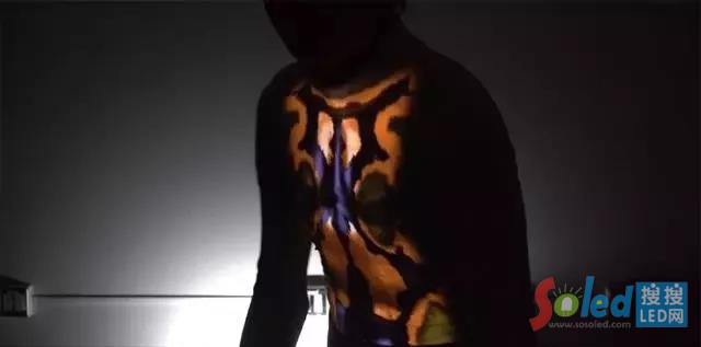 在這項(xiàng)技術(shù)的最新版本上,增加了一個(gè)三維光映射元素,進(jìn)一步加深了視覺上的錯(cuò)覺,使投影看起來像一個(gè)真實(shí)的發(fā)光3D物體。演示視頻中顯示了各種拉伸紋理,實(shí)時(shí)響應(yīng)運(yùn)動(dòng),反射光源的金屬在上面閃閃發(fā)光,看起來像是一個(gè)奇怪的,不均勻的有機(jī)形態(tài),像是一條纏繞在移動(dòng)人體上的“外星蛇”。