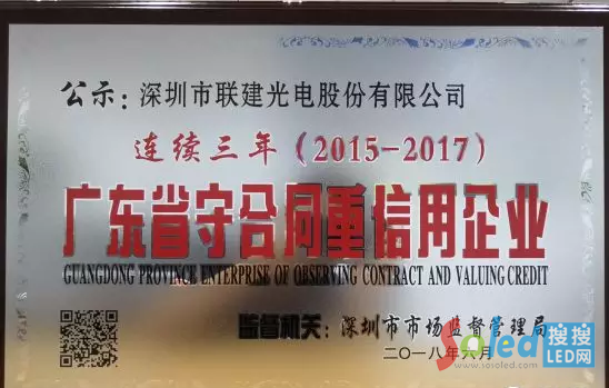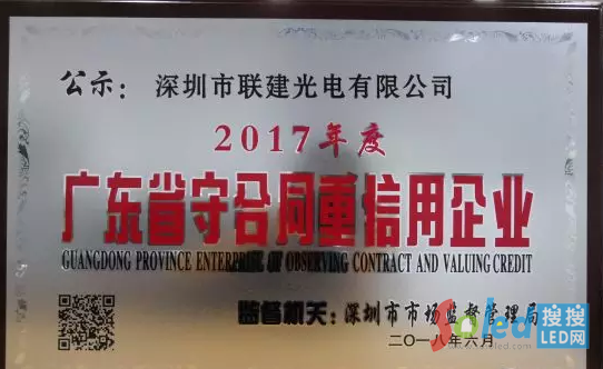 實(shí)至名歸|聯(lián)建光電再獲2017年度“廣東省守合同重信用企業(yè)”稱號