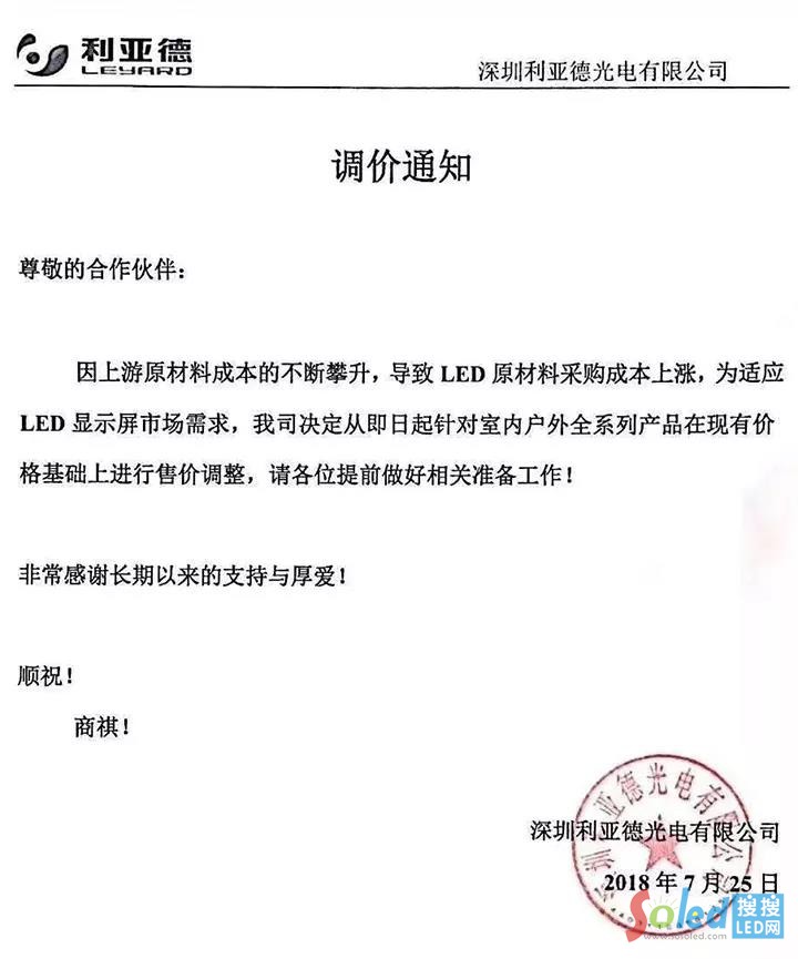核心提示:7月25日深圳利亞德光電有限公司發(fā)布一份調(diào)價通知宣稱:因為上游原材料成本的不斷攀升,導(dǎo)致LED原材料采購成本上漲,為了適應(yīng)LED顯