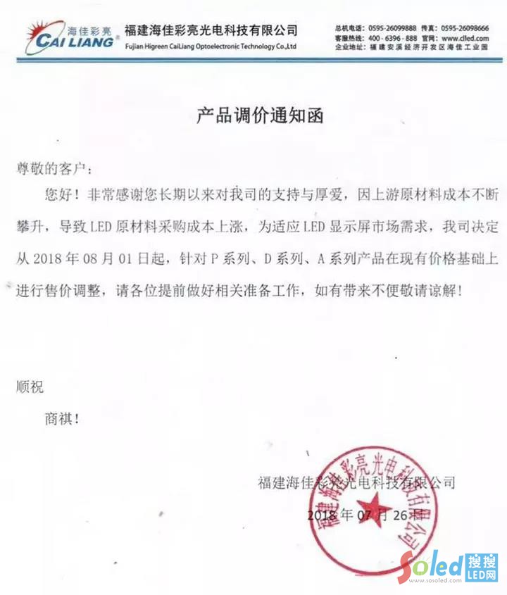 7月25日深圳利亞德光電有限公司發(fā)布一份調(diào)價通知宣稱:因為上游原材料成本的不斷攀升,導(dǎo)致LED原材料采購成本上漲,為了適應(yīng)LED顯示屏市場的需求,決定對室內(nèi)外全系列產(chǎn)品,進行調(diào)整。接著26日福建海佳彩亮光電科技有限公司也發(fā)布產(chǎn)品調(diào)價通知函,對三種系列的產(chǎn)品進行了調(diào)整。至此以利亞德為首的下游顯示屏大企業(yè)漲價風(fēng)潮已悄然來襲。