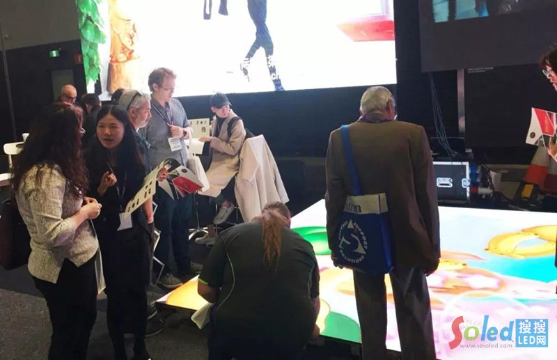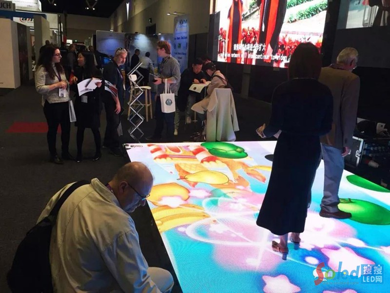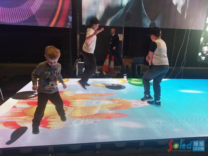 本次展出的P4.81 LED互動地磚屏,采用全新的納米鍍膜模式,在承重、防護性能、及散熱性能等方面做過特殊設計,能適應高強度踩踏,長時間正常運行。其紅外感應設計,可以跟蹤人的運動軌跡,能夠跟隨人體的活動呈現(xiàn)即時的畫面效果。