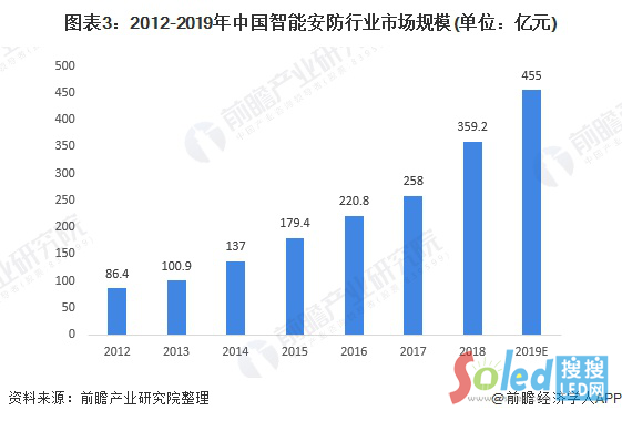 根據(jù)中安網(wǎng)的數(shù)據(jù)顯示,2018年我國(guó)安防行業(yè)總產(chǎn)值為7183億元,目前我國(guó)智能安防滲透率約為5%,前瞻測(cè)算2018年我國(guó)智能安防市場(chǎng)規(guī)模為359.2億元。2012-2018年市場(chǎng)規(guī)模年復(fù)合增長(zhǎng)率高達(dá)26.8%,根據(jù)年復(fù)合增長(zhǎng)率,前瞻估算,2019年我國(guó)智能安防市場(chǎng)規(guī)模約為455億元。