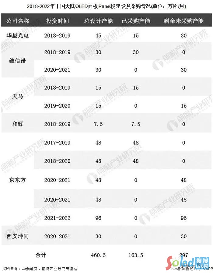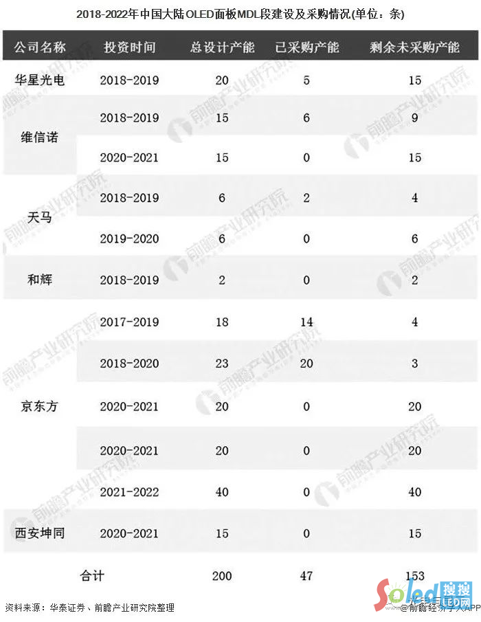 國內(nèi)OLED產(chǎn)線建設(shè)主要包括Panel段建設(shè)和MDL段建設(shè)。2018-2022年,中國大陸共有6家公司投入OLED面板Panel段建設(shè),總設(shè)計產(chǎn)能達(dá)46.05萬片/月,目前已采購產(chǎn)能16.35萬片/月。2018年-2022年計劃總投資MDL產(chǎn)線200條,目前已采購MDL產(chǎn)線47條,剩余153條將在2022年之前完成。隨著OLED應(yīng)用的普及,預(yù)計國內(nèi)OLED產(chǎn)線建設(shè)將會加快。