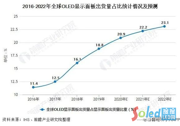 同時,2019年全球OLED顯示面板出貨量占全球顯示面板出貨量的比重由2016年的11.4%提高到18.8%,隨著OLED滲透率的提高,這一比重還將持續(xù)提高,預(yù)計到2022年這一比重將達(dá)到23.1%。