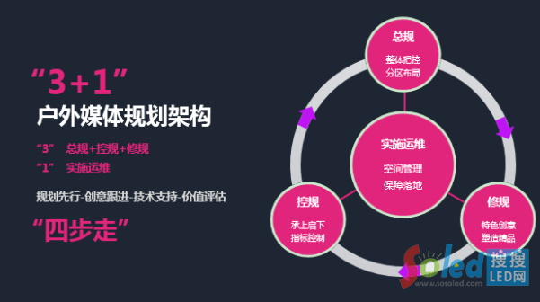 這是城市媒體規(guī)劃項(xiàng)目中推行的系統(tǒng)架構(gòu),一個(gè)3+1 的體系,在總控修基礎(chǔ)上更強(qiáng)調(diào)實(shí)施運(yùn)維,換個(gè)說(shuō)法就是通過(guò)空間管理與價(jià)值評(píng)估體系保障項(xiàng)目實(shí)施落地。從規(guī)劃策略上我們可以分四步走,規(guī)劃先行、創(chuàng)意跟進(jìn)、技術(shù)支持直到最后的價(jià)值評(píng)估,要對(duì)業(yè)主方、資源方負(fù)責(zé)。