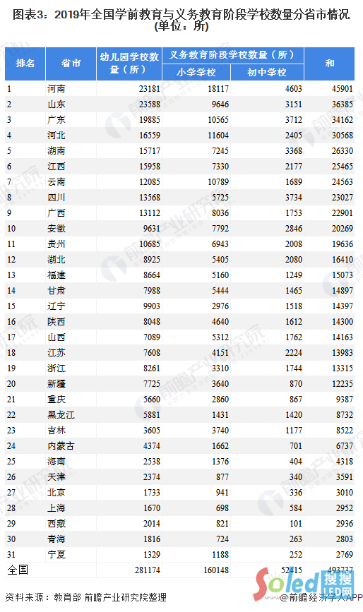 根據(jù)教育部數(shù)據(jù)可知,2019年全國學前教育與義務教育階段學校數(shù)量分省市排名情況中,河南、山東、廣東、河北、湖南、江西、云南、四川、廣西、安徽為數(shù)量排名前十省份,河南省以45901所為全國學前教育與義務教育階段學校數(shù)量總和之首,西藏、青海、寧夏學前教育與義務教育階段學校數(shù)量相對較少。