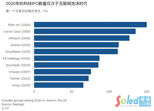 盡管這一年充滿不確定性,但在2020年仍有65家科技公司上市,不免讓人想起當(dāng)年的互聯(lián)網(wǎng)泡沫時(shí)期,心有戚戚。云計(jì)算公司Snowflake和外賣(mài)配送應(yīng)用DoorDash的表現(xiàn)都不俗,而Airbnb的成就更加耀眼。Airbnb的股價(jià)在12月上市的交易首日便翻了一倍。