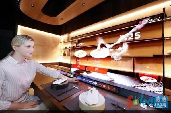 ‘餐廳展區(qū)’的展示理念是展示受新冠肺炎影響不見(jiàn)面時(shí)代的場(chǎng)景。展示在餐廳里在客人與廚師之間用透明OLED做分區(qū),在看菜單的同時(shí),等待出菜時(shí)間觀看體育賽事。