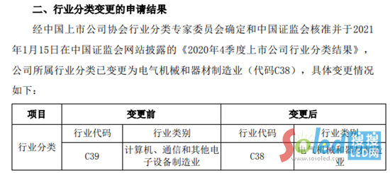 1月19日,木林森發(fā)布《關(guān)于公司所屬行業(yè)分類變更的公告》表示,公司所屬行業(yè)分類已變更為電氣機(jī)械和器材制造業(yè)。