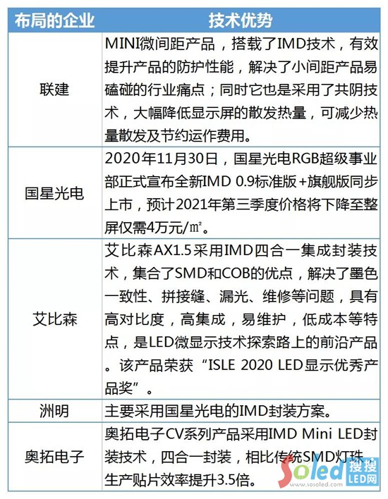 目前來看,聯(lián)建光電、艾比森、洲明等上市企業(yè)在此領(lǐng)域發(fā)展迅速,他們推出了IMD四合一集成封裝技術(shù)的Mini LED產(chǎn)品。奧拓電子是國(guó)內(nèi)最早研發(fā)Mini LED多合一技術(shù)的企業(yè),早在2013年的ISE展會(huì)上,就展出了集成式多合一Mini LED技術(shù)品。2020 isle展會(huì)上,信達(dá)也推出了IMD多合一集成封產(chǎn)品,目前在市場(chǎng)上已經(jīng)形成了一定知名度。預(yù)計(jì),2021年,IMD四合一、多合一技術(shù)仍然是企業(yè)擁躉,會(huì)有不少企業(yè)進(jìn)行布局。