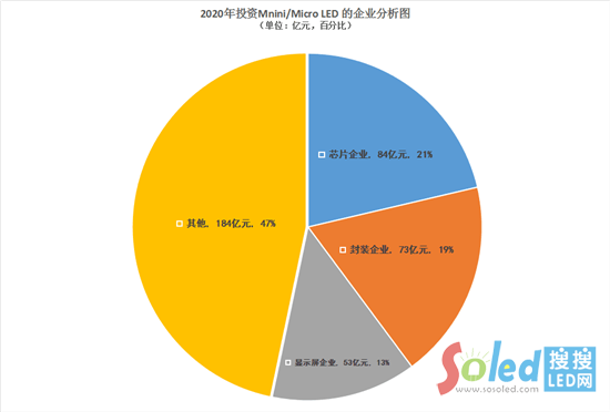 從統(tǒng)計(jì)數(shù)據(jù)的信息來看,2020年投資Mini/Micro LED企業(yè)有27家,其中芯片企業(yè)(6家),包括晶電、三安光電、兆馳股份、華燦光電、乾照光電、聚燦光電,總投資約為84億元,占總比約為21%;封裝企業(yè)(4家),包括東貝、鴻利智匯、國(guó)星光電、木林森,總投資為73億元,占總比為19%;顯示屏企業(yè)(8家),包括洲明、雷曼光電、維信諾、瑞豐光電、億光、深德彩、利亞德、隆利科技,總投資約為53億元,占總比為13%;其他企業(yè),包括錼創(chuàng)(臺(tái)企)、惠特(臺(tái)企)、Aledia、北大青鳥、三星、蘋果, 以及檢測(cè)設(shè)備公司1家(精測(cè)電子)、新創(chuàng)企業(yè)1家(思坦科技)、面板廠家TCL華星,總投資額184億元,總占比為47%。