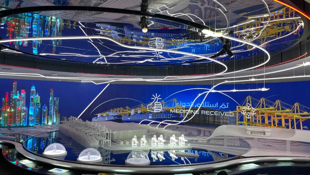在迪拜環(huán)球港務(wù)集團(tuán)展館,結(jié)構(gòu)縱深有度,線條錯(cuò)落有致,近400㎡LED光顯產(chǎn)品如栩栩如生的藝術(shù)品般,極具設(shè)計(jì)感。環(huán)顧一周,城市天際線五光十色,林林總總的建筑隨著畫面躍起,這座空間不再有虛實(shí)!
