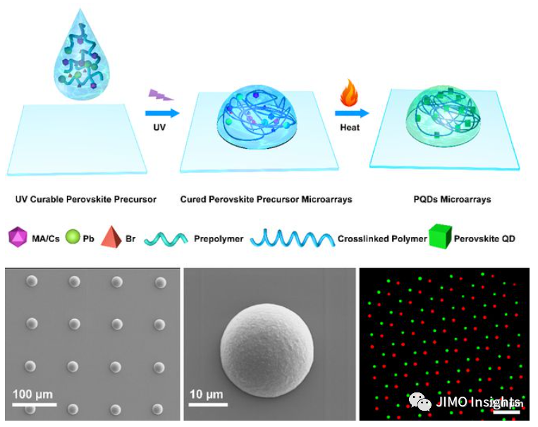 MicroLED是實現(xiàn)虛擬/增強現(xiàn)實(VR/AR)顯示的重要技術(shù),而全彩化是其發(fā)展所面臨的關(guān)鍵挑戰(zhàn)。量子點色轉(zhuǎn)換技術(shù)(QDCC)將紅、綠量子點色轉(zhuǎn)換膜置于藍光microled上取代紅、綠LED,被認為是解決MicroLED顯示所面臨的紅光LED缺失、巨量轉(zhuǎn)移等難題的候選技術(shù)路線之一。與傳統(tǒng)CdSe和InP量子點相比,鈣鈦礦量子點具有高的吸收系數(shù)、可原位制備等特點,成為量子點色轉(zhuǎn)換應(yīng)用的重要材料體系之一。北京理工大學(xué)智能光子學(xué)課題組是國際上最早開展鈣鈦礦量子點的課題組之一。2015年,張峰、吳顯剛等人發(fā)明了鈣鈦礦量子點再沉淀制備技術(shù),首次展示了鈣鈦礦量子點的寬色域LED器件(ACS Nano 2015, 9, 4533);2016年,周青超等人發(fā)明了鈣鈦礦量子點原位制備技術(shù)(Advanced Materials 2016, 28, 9163),經(jīng)過產(chǎn)學(xué)研合作,在全球率先推出了搭載鈣鈦礦量子點光學(xué)膜的電視樣機和首批商業(yè)化電視。近日,該團隊的楊高嶺特別副研究員與光電學(xué)院趙躍進教授合作,將微透鏡結(jié)構(gòu)引入Micro LED發(fā)光像素中,構(gòu)筑出了具有三維結(jié)構(gòu)的新型鈣鈦礦量子點微陣列,相關(guān)研究成果以“Perovskite Quantum Dot Microarrays: In Situ Fabrication via Direct Print Photopolymerization”為題,在國際知名期刊Nano Research上發(fā)表(DOI:10.1007/s12274-022-4466-4)。立足Micro LED量子點色轉(zhuǎn)換技術(shù),本工作提出了將噴墨打印與光聚合結(jié)合的策略,發(fā)明了直接打印光聚合原位制備技術(shù),原位制備出具有微透鏡光學(xué)結(jié)構(gòu)的鈣鈦礦量子點圖案,實現(xiàn)了像素尺寸20微米、高度接近10微米的半球形三維鈣鈦礦量子點彩色微陣列,為解決打印像素中發(fā)光不均勻、藍光泄露等問題提供了新的思路,為Micro LED色轉(zhuǎn)換、CCD紫外增強探測等光轉(zhuǎn)換應(yīng)用提供了新的技術(shù)路線。