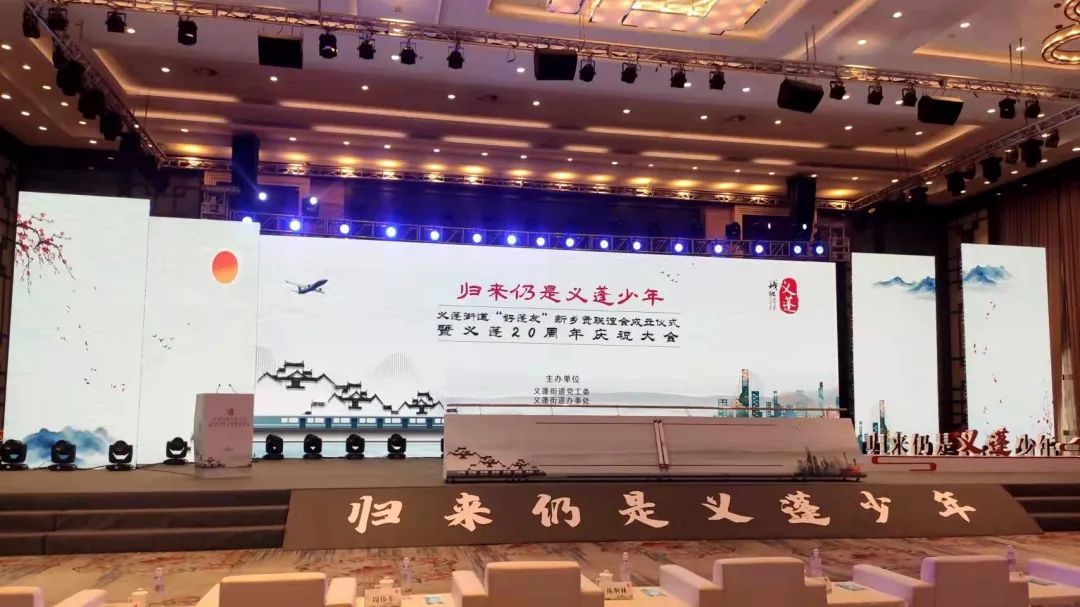 鄉(xiāng)賢齊聚,共報桑梓。義蓬街道20周年慶祝大會屏體分辨率5120*1280,點間距P3.91,屏體面積100㎡,配合Kompass RX6+S400+C3D12+K16全鏈路解決方案,靈活控制,穩(wěn)定可靠。