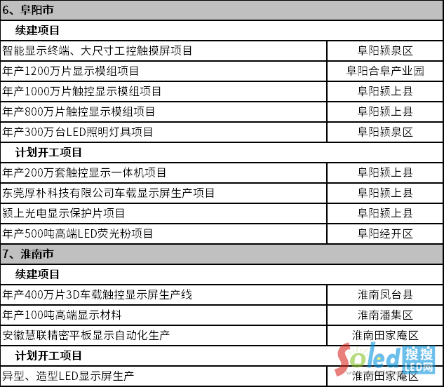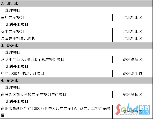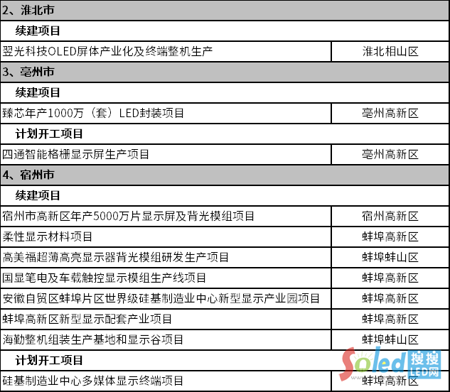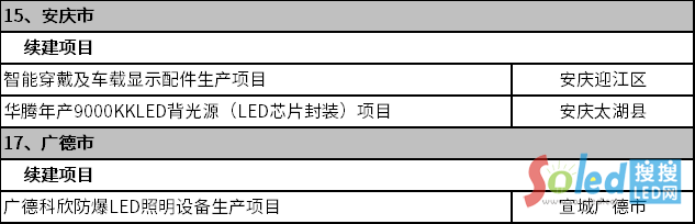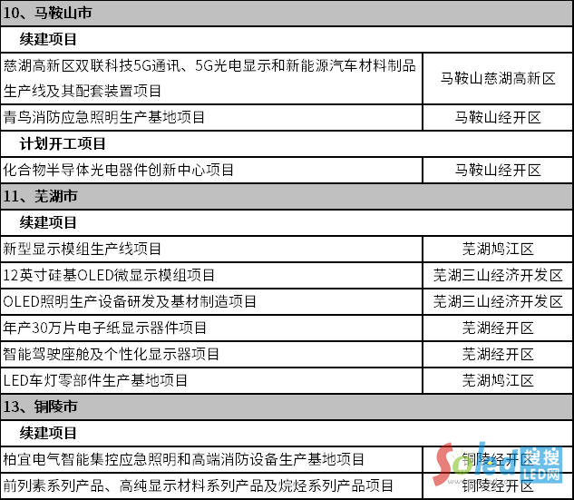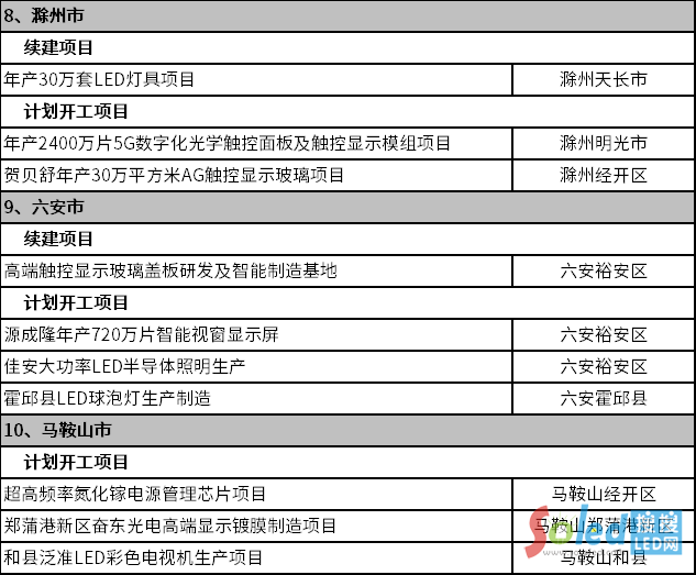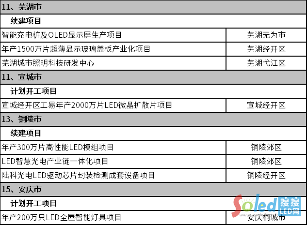 B類中,計(jì)劃開工項(xiàng)目包括“年產(chǎn)500噸高端LED熒光粉項(xiàng)目”、“異型、造型LED顯示屏生產(chǎn)”、“佳安大功率LED半導(dǎo)體照明生產(chǎn)”、“宣城經(jīng)開區(qū)工易年產(chǎn)2000萬片LED微晶擴(kuò)散片項(xiàng)目”等。
