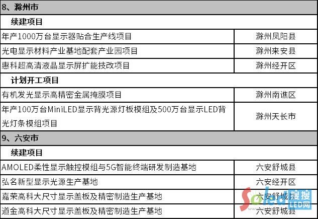 B類中,續(xù)建項(xiàng)目包括“京東方MiniLED(合肥)生產(chǎn)線項(xiàng)目”、“第6代觸摸屏生產(chǎn)線MiniLED背光背板項(xiàng)目”、“Mini/Micro LED玻璃基中小尺寸背光線項(xiàng)目”、“世林融徽LED照明光源與燈具研發(fā)基地項(xiàng)目”等。
