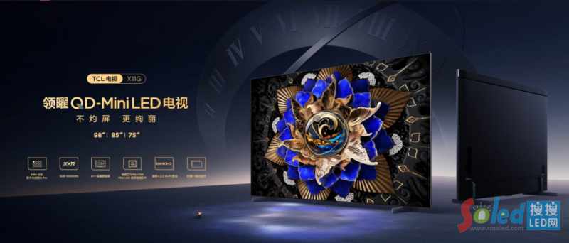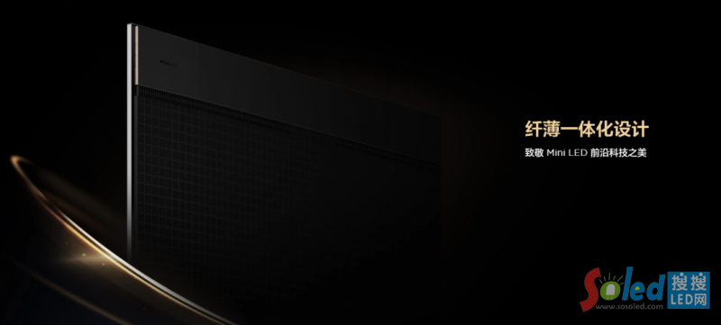 TCL X11G整機采用纖薄一體化設計,背部采用獨具特色的Mini LED星空紋理,呈現(xiàn)出科技之美。Mini LED背光作為顯示產(chǎn)品中的一個功能組件,不僅要考慮Mini LED背光燈板本身的薄型化,還要考慮整個背光模組的薄型化。