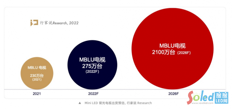 據(jù)行家說Research預估2022年Mini LED背光電視(含COB和POB)出貨量將增長19.57%,隨著Mini背光產(chǎn)業(yè)鏈各環(huán)節(jié)技術(shù)工藝的成熟,未來幾年成本將保持快速下降,其在顯示應用的滲透率也將逐步提升,至2026年Mini LED背光電視將增長至2100萬臺。