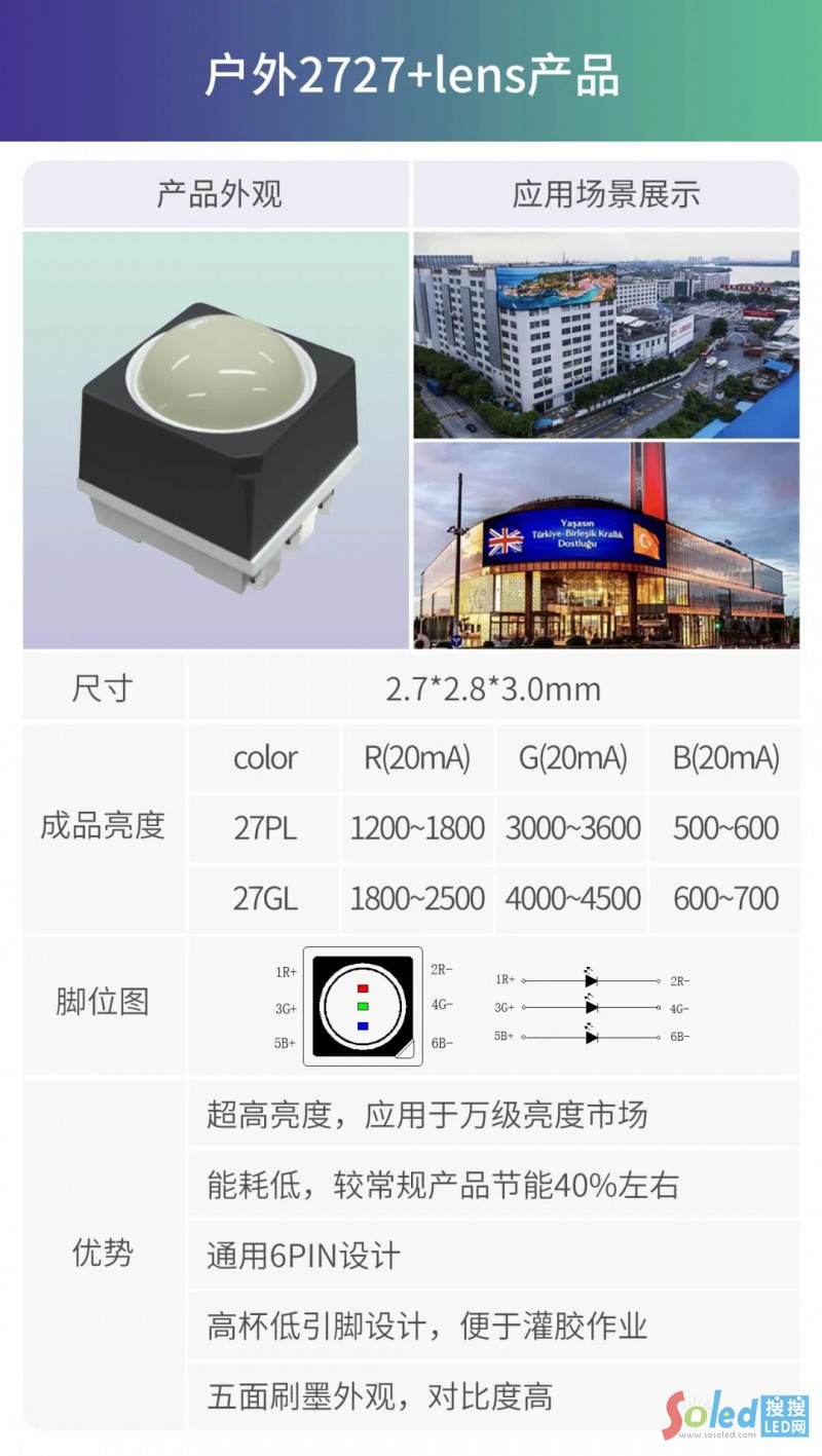 通過技術(shù)革新,2727+lens產(chǎn)品較原有2727產(chǎn)品亮度同比提升30%~50%以上,比如原有2727亮度6000nit,相同配置情況下2727+lens產(chǎn)品亮度提升至10000nit。2727+lens新品具有高亮度、低能耗、高可靠性、高性價(jià)比等顯著特點(diǎn),可適配商店標(biāo)牌、廣告牌、電視墻、交通指示屏、亮化市場等多種戶外顯示場景的應(yīng)用需求。
