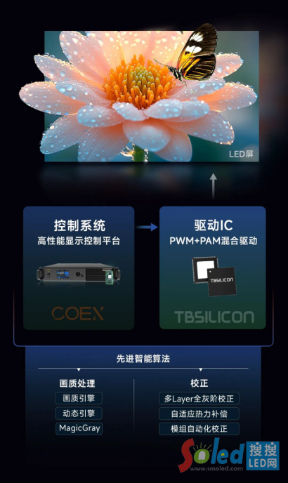 長久以來,傳統(tǒng)PWM脈寬調(diào)制驅(qū)動(dòng)技術(shù)是制約MLED顯示屏畫質(zhì)提升的關(guān)鍵瓶頸,恒流PWM單一驅(qū)動(dòng)機(jī)制難以滿足COB時(shí)代對像素密度、掃描速度、電流微細(xì)化的高要求,在動(dòng)態(tài)范圍、刷新率、色準(zhǔn)等核心維度的表現(xiàn)逐漸觸頂;谑嗄觑@示領(lǐng)域的技術(shù)積累,諾瓦星云推出的無極Infinity解決方案,以PWM+PAM混合驅(qū)動(dòng)技術(shù)為核心,通過控制系統(tǒng)、混合驅(qū)動(dòng)IC與自研核心算法的深度協(xié)同,實(shí)現(xiàn)了 “五高兩低” 的全面突破,一舉打破傳統(tǒng)技術(shù)的發(fā)展桎梏。