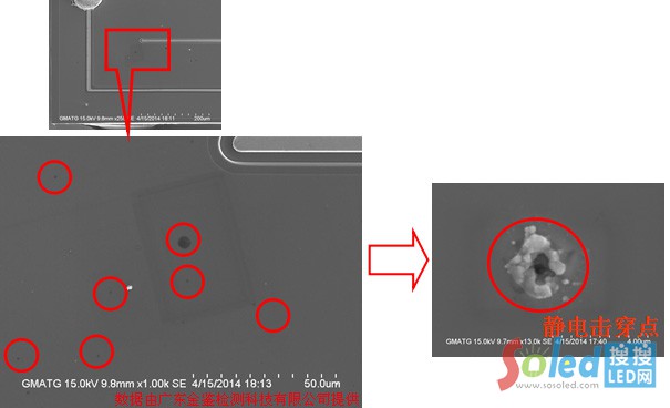 某客戶生產(chǎn)的一批燈珠出現(xiàn)漏電問(wèn)題,委托金鑒查找原因。金鑒通過(guò)掃描電鏡鑒定這批燈珠漏電原因?yàn)殪o電擊穿,并對(duì)供應(yīng)商提供的裸晶進(jìn)行檢測(cè),發(fā)現(xiàn)芯片外延層表面有大量黑色空洞,這些缺陷表明外延層晶體質(zhì)量較差,PN結(jié)內(nèi)部存在缺陷?斩吹陌l(fā)現(xiàn),幫助客戶明確責(zé)任事故的負(fù)責(zé)方,替客戶挽回?fù)p失。