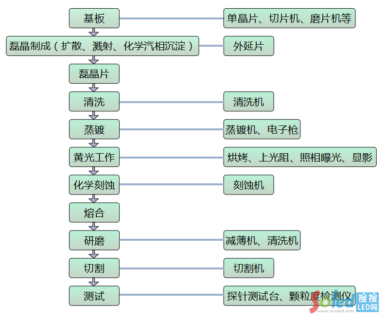 外延片→清洗→鍍透明電極層→透明電極圖形光刻→腐蝕→去膠→平臺(tái)圖形光刻→干法刻蝕→去膠→退火→SiO2沉積→窗口圖形光刻→SiO2腐蝕→去膠→N極圖形光刻→預(yù)清洗→鍍膜→剝離→退火→P極圖形光刻→鍍膜→剝離→研磨→切割→芯片→成品測(cè)試。