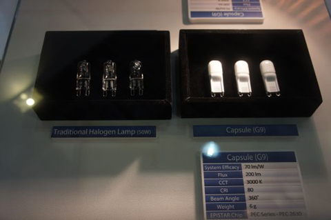 從晶電展出最新的G9豆燈產(chǎn)品來看,其流明值為200lm,發(fā)光效率為70lm/W,晶電指出,市售G9豆燈流明值多為100lm,晶電特別為客戶開發(fā)200lm產(chǎn)品,除了流明值與發(fā)光效率外,這項(xiàng)新產(chǎn)品也符合法規(guī)對于傳統(tǒng)G9燈泡兩根接腳重量小于12克的規(guī)范。