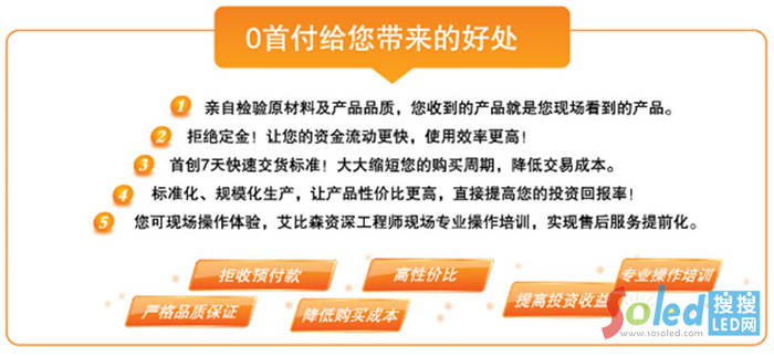 第六、艾比森實行“零首付”的意義,還在于讓“零首付”變成行業(yè)的游戲規(guī)則。我們深信,當(dāng)“零首付”變成行業(yè)的游戲規(guī)則的時候,受益的一定是客戶。如此,就讓那些騙子公司見鬼去;讓那些等米下鍋的個體戶,經(jīng)受一次考驗;讓客戶對LED更有信心!